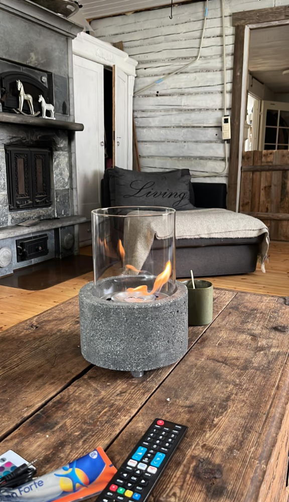 Bioetanolilla toimiva betonilyhty sisä- ja ulkokäyttöön. Lasinen tuulissuoja. Bioetanoli myydään erikseen.