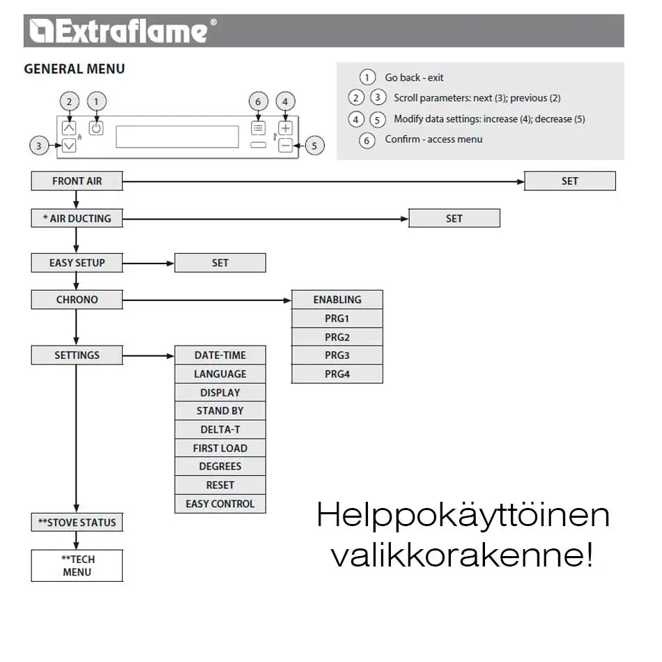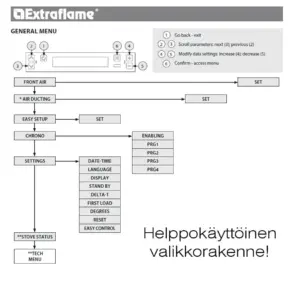 Muuta helposti pelletinsyöttömäärää näyttöpaneelin EASY valikosta. Mikäli käyttämäsi pelletti on hienojakoista tai harvaa, voit asettaa valikosta toisen asetuksen ja takka säätää pelletin syötön määrää ja savukaasumoottorin imutehoa automaattisesti oikeaan suuntaan (katso kuva).